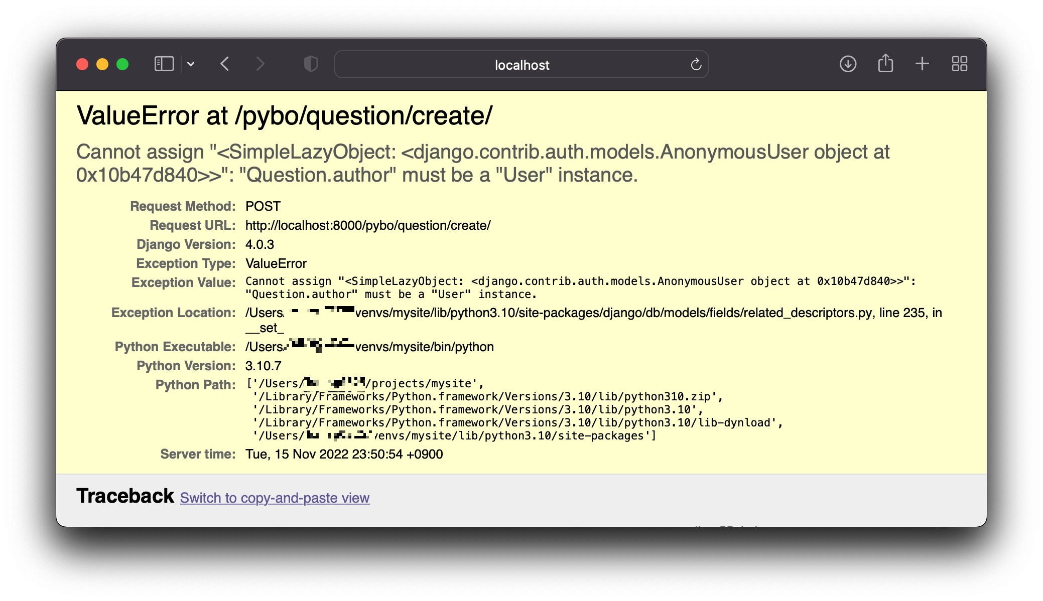 하지만 로그아웃 상태에서 질문 또는 답변을 등록하면 다음과 같은 ValueError가 발생한다.