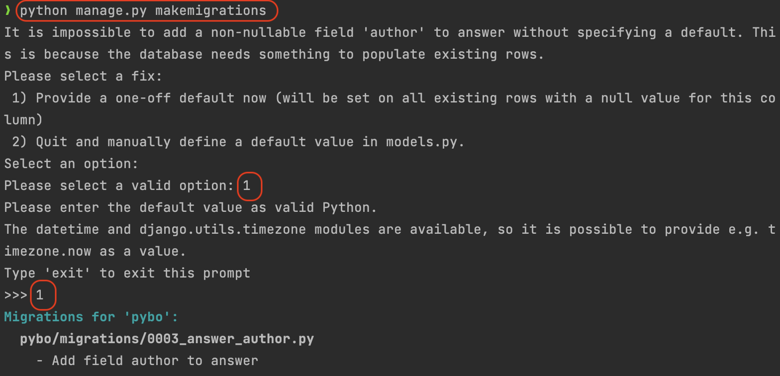 명령어를 입력하면 옵션을 선택하라는 메세지가 나온다. Question 모델에 author 를 추가하면 이미 등록되어 있던 게시물에 author 에 해당되는 값이 저장되어야하는데, author 에 어떤 값을 넣어야 하는지 모르기 때문이다. 그것에 관해 어떤 옵션을 선택하라는지 묻는것이다.