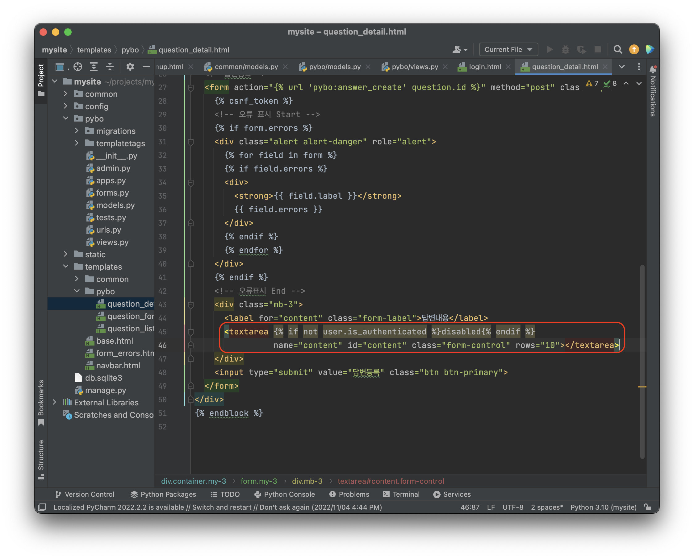 의미를 해석하자면 로그인 상태가 아닌 경우 textates 태그에 disabled 속성을 적용하여 입력을 못하게 만들었다. 보면 알겠지만 {% if not user.is_authenticated %} 태그는 현재 사용자가 로그아웃 상태인지를 체크하는 태그이다.
