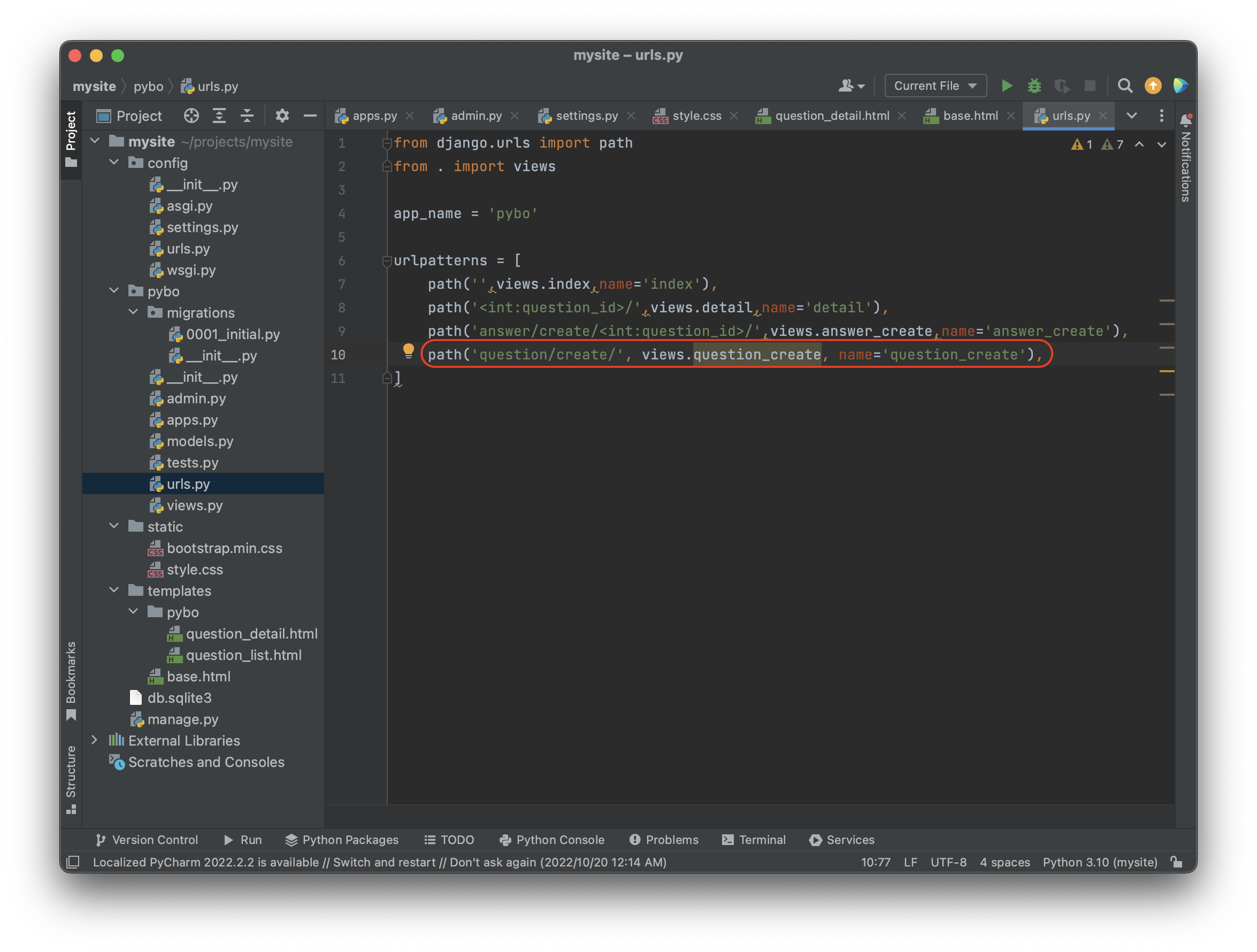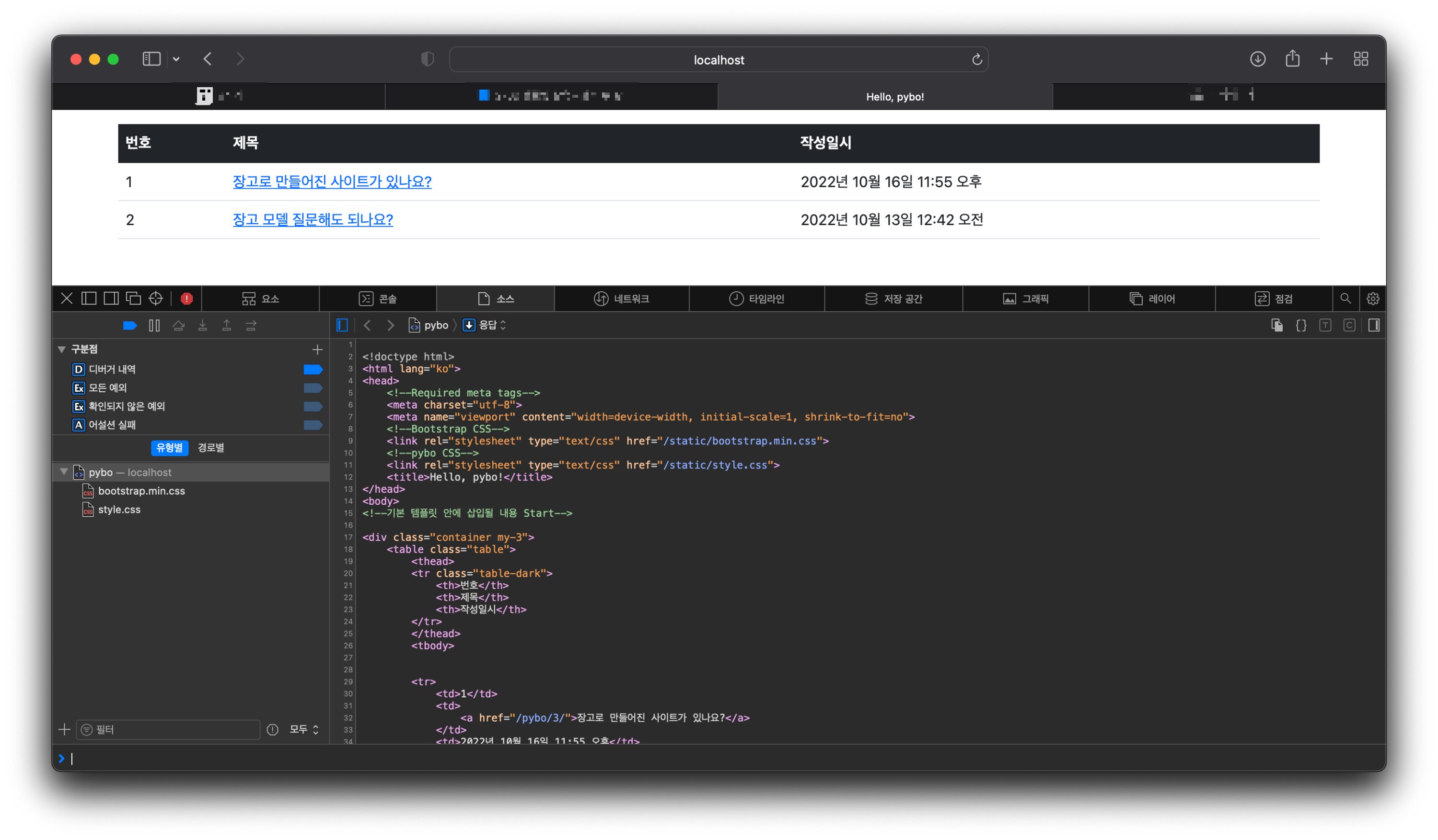 이제 / 페이지 요청에 대해 path('', views.index, name='index') 가 작동하여 pybo/views.py 파일의 index 함수가 실행된다.