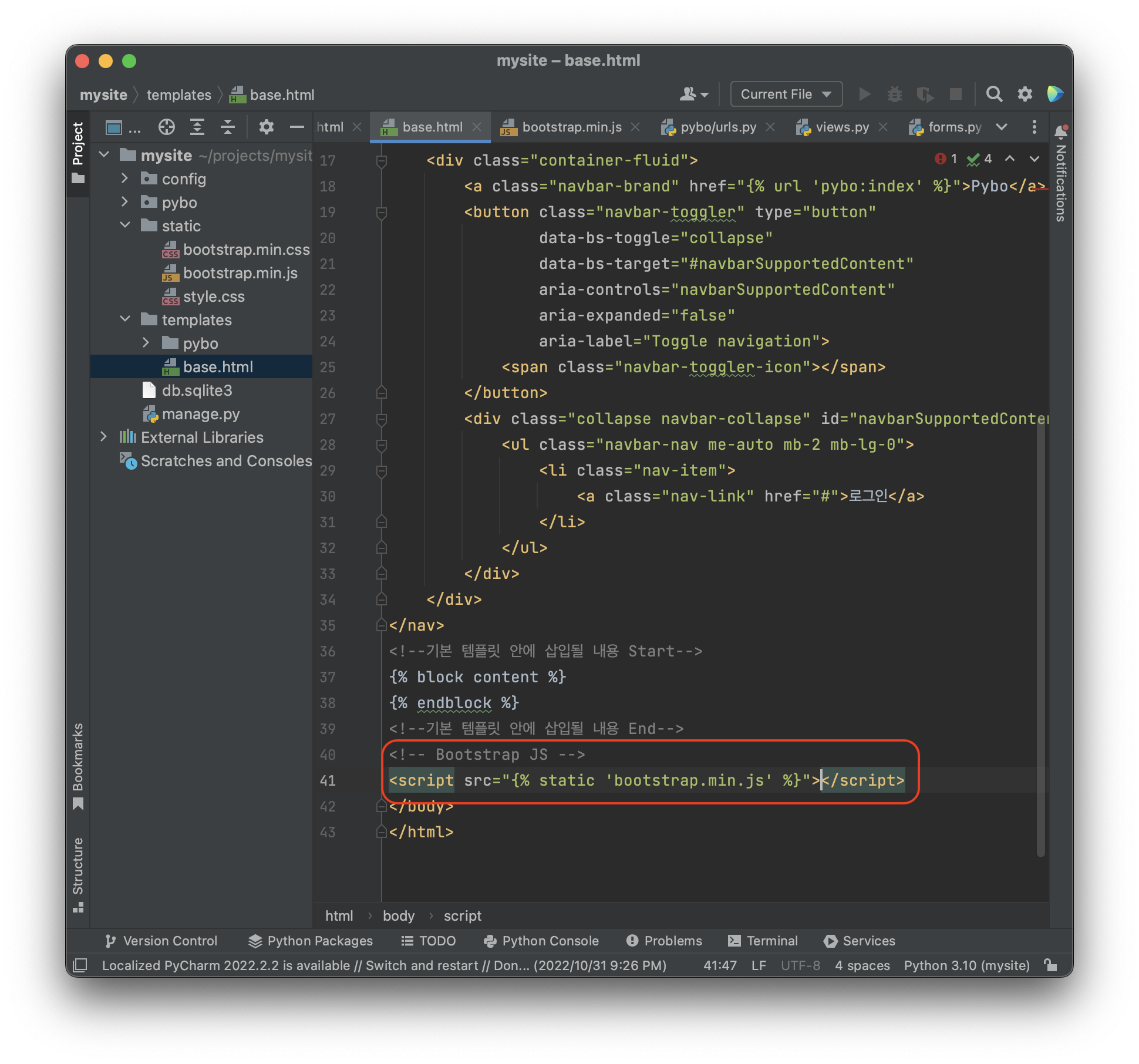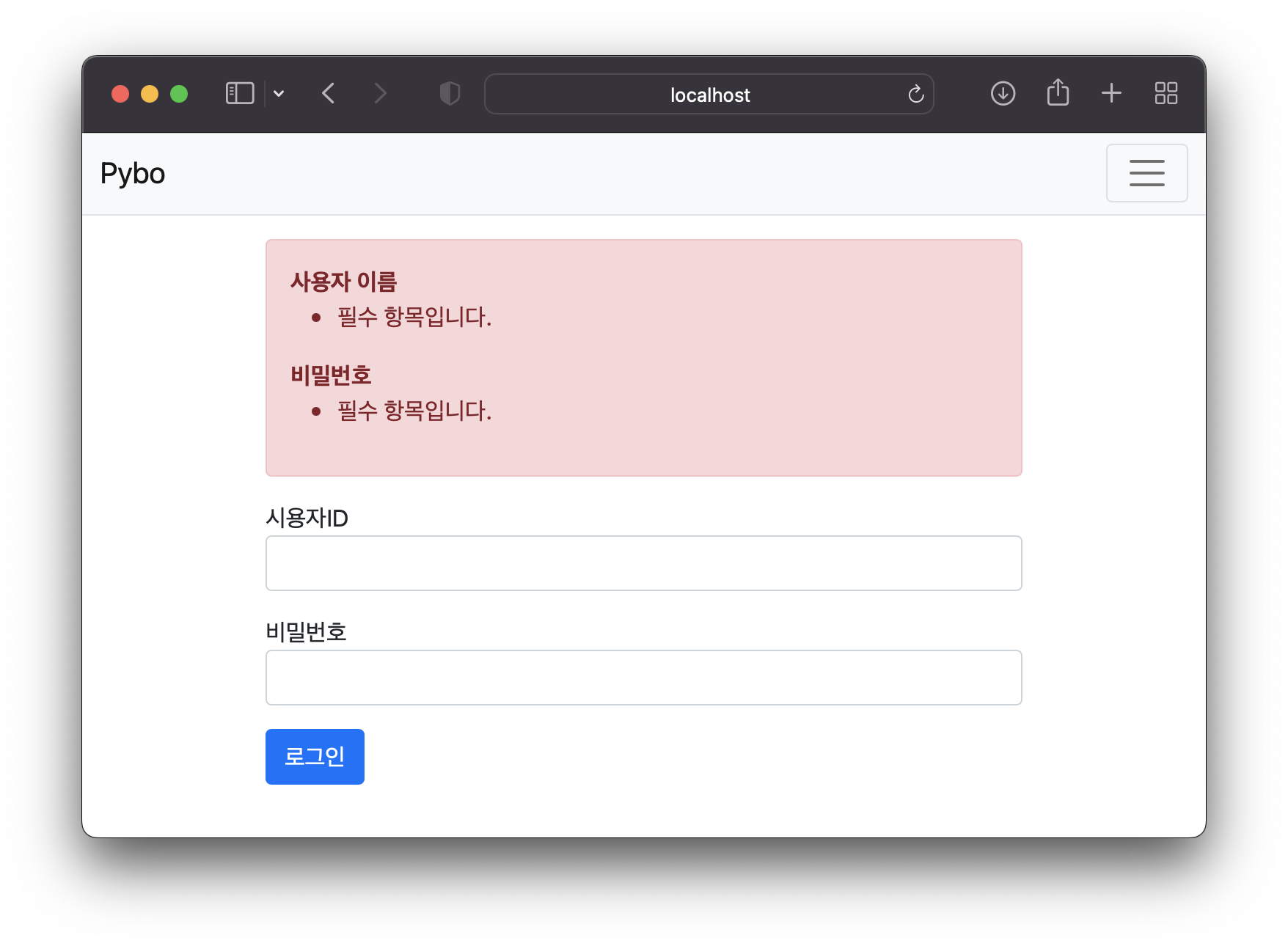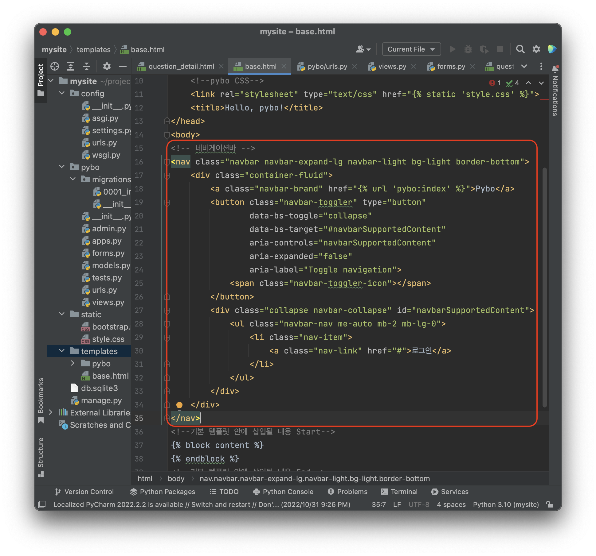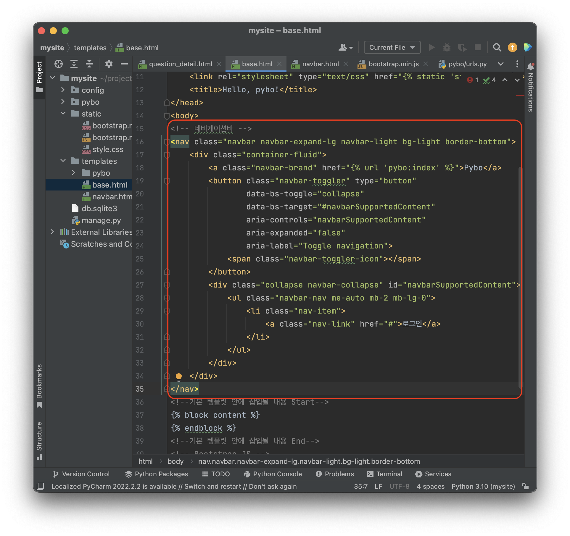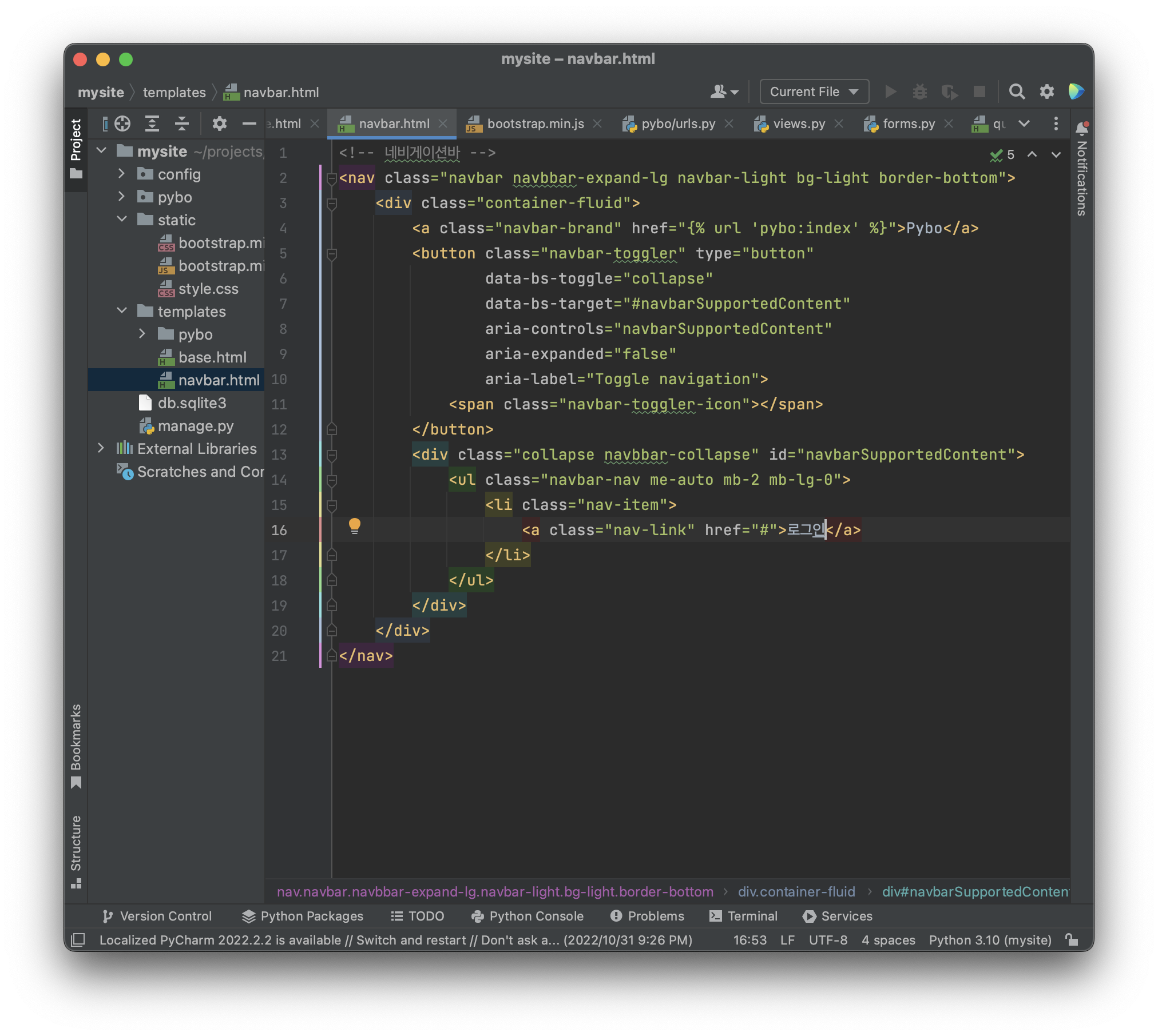 먼저 로그인 화면으로 진입할 수 있도록 projects\mysite\templates\navbar.html 파일의 로그인 링크를 다음처럼 수정하자.