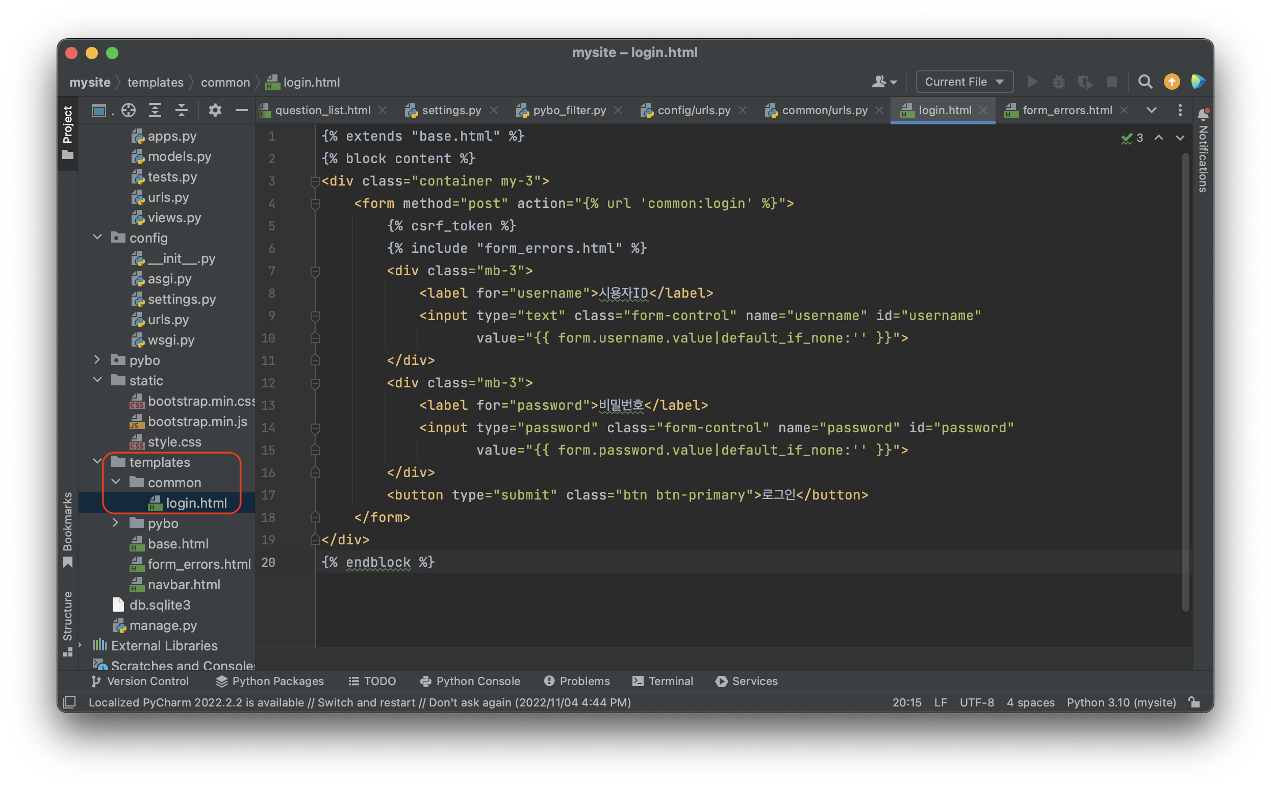 그렇다면 common/login.html 파일을 생성하기 위해 common 템플릿 디렉토리를 다음과 같이 생성하자. 그 후 login.html 파일을 만들자. projects\mysite\templates\common\login.html 에 다음과 같이 작성하자.