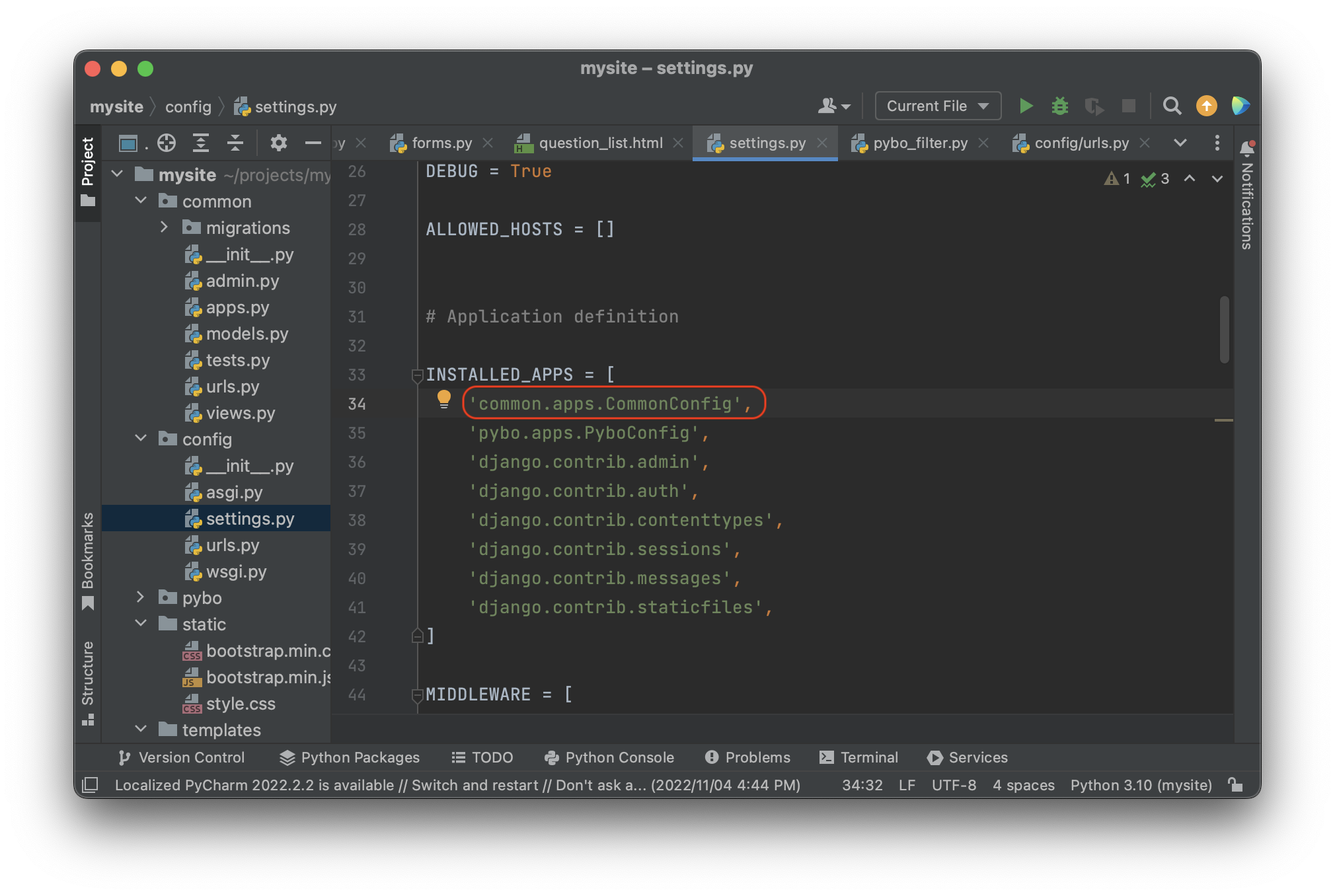 그리고 config\settings.py 파일에 방금 생성된 common 앱을 등록하면된다.