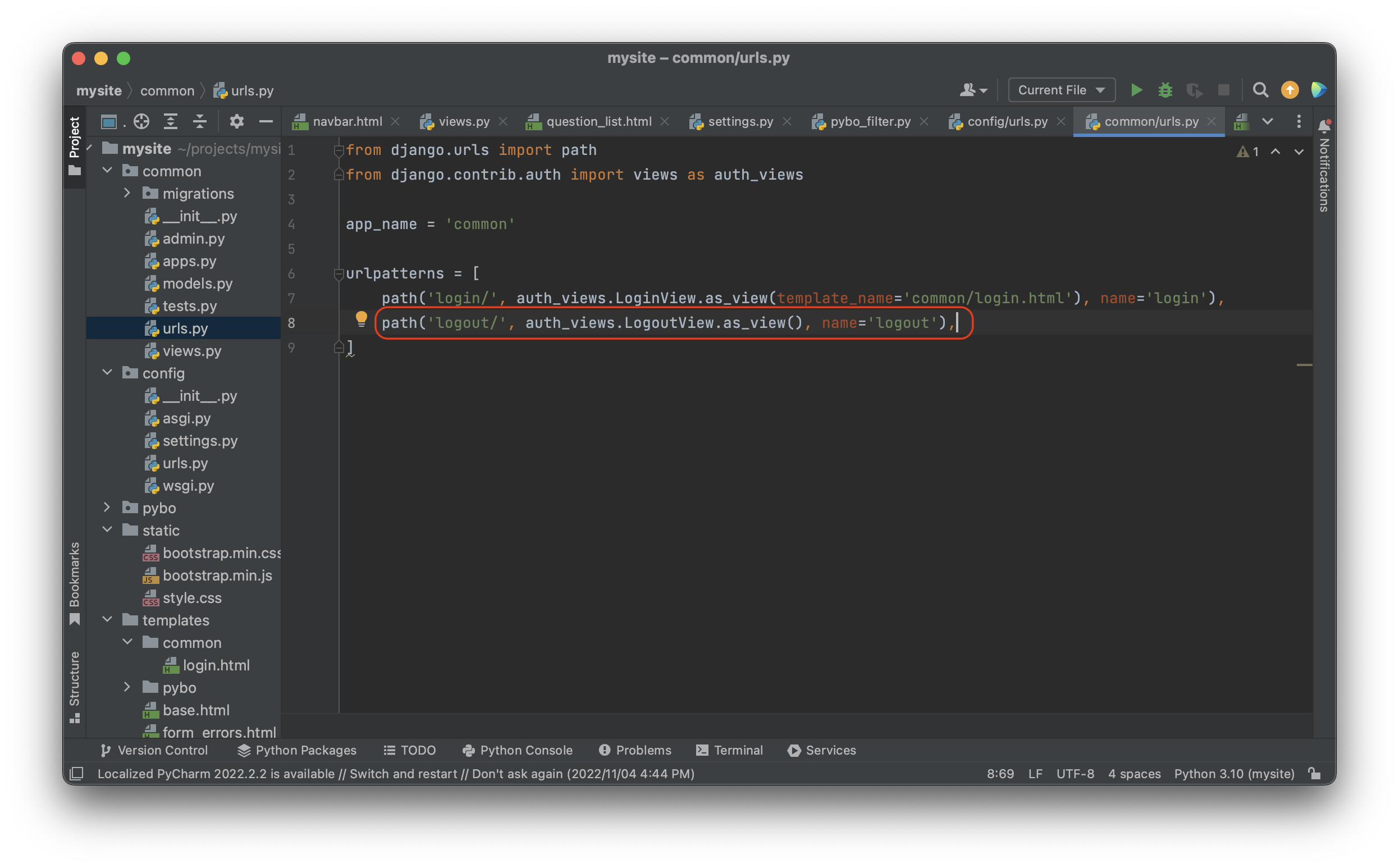 로그아웃 링크가 추가되었으므로 {% url 'common:logout' %}에 대응하는 URL 매핑을 추가해야한다. projects\mysite\common\urls.py 파일을 다음과 같이 수정하자.