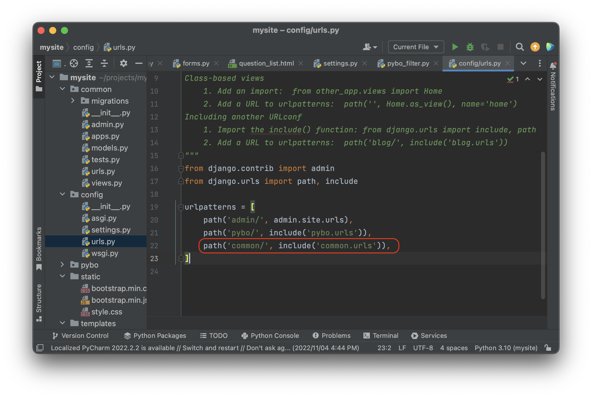 common 앱의 urls.py 파일을 사용하기 위해 projects\mysite\config\urls.py 파일을 다음과 같이 수정하자.
