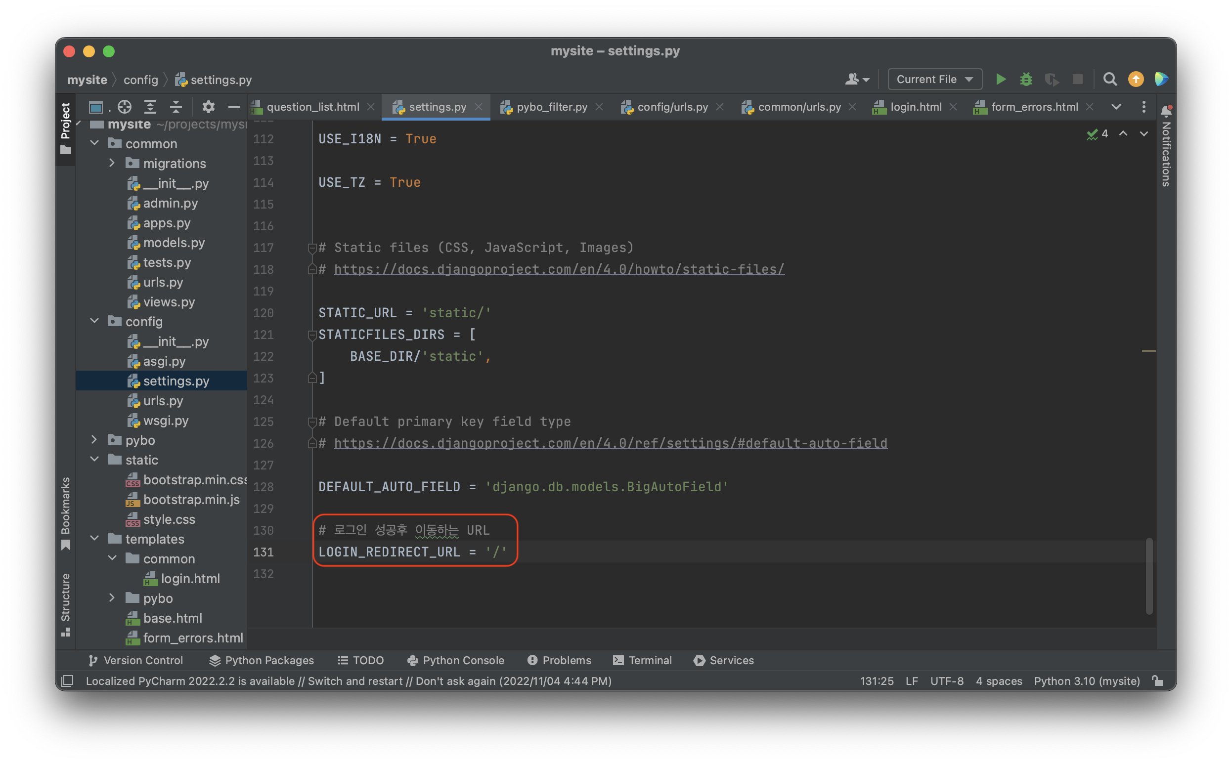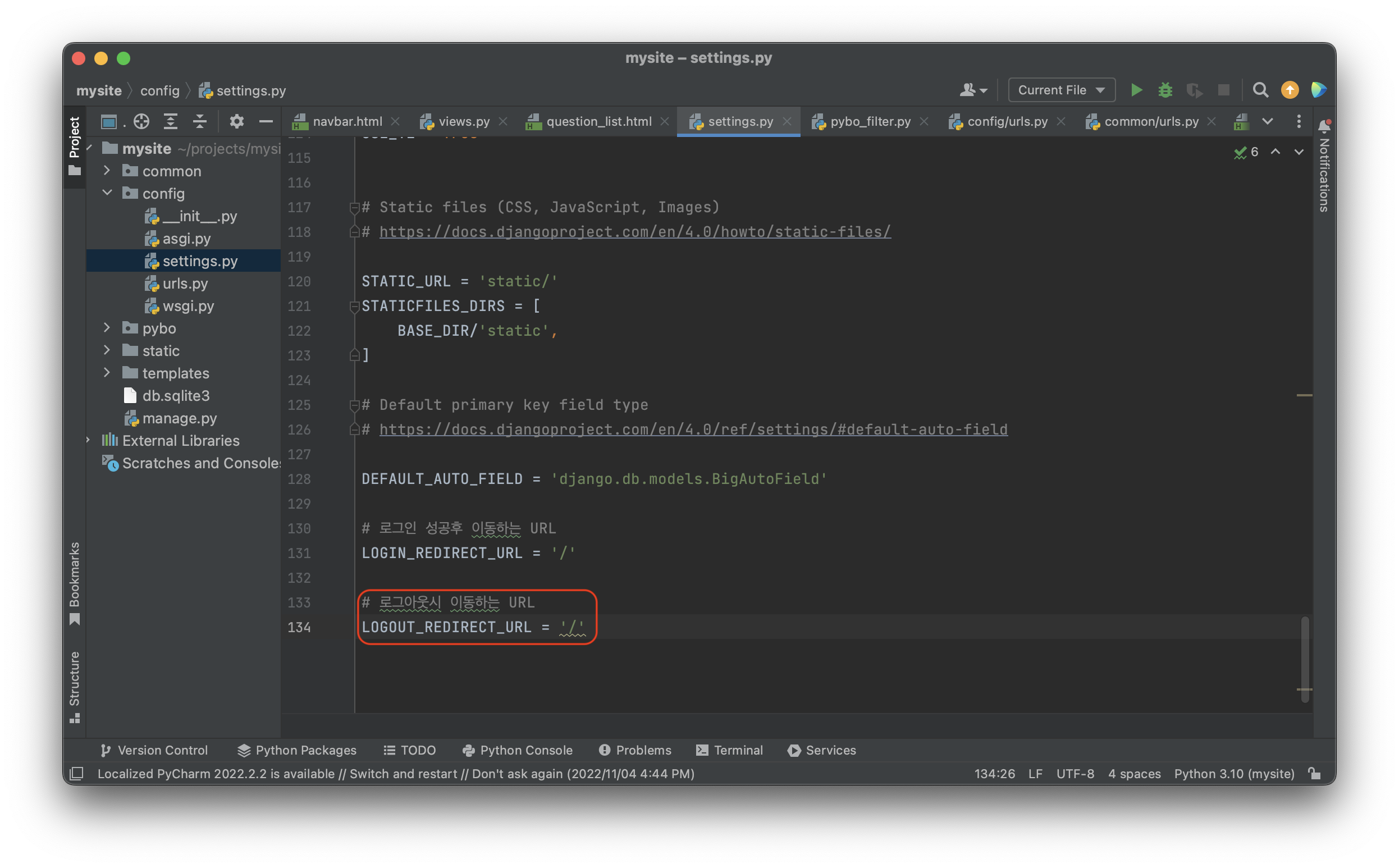 잘 적용되어있다. 로그아웃 시 이동할 위치도 projects\mysite\config\settings.py 파일에 추가하자.