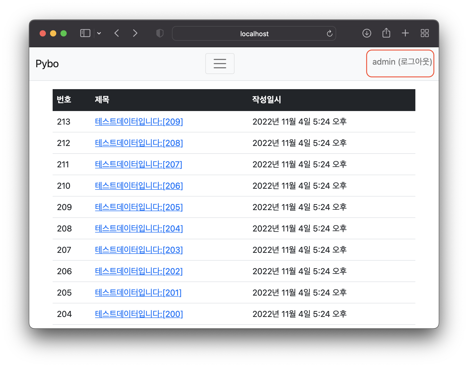 이제 로그인에 성공하면 정상적으로 작동한다. 하지만 로그인을 했음에도 로그인 버튼이 로그아웃버튼으로 바뀌지 않고 여전히 로그인 버튼으로 남아있다. 이를 해결하기위해 proejcts\mysite\templates\navbar.html 을 다음과 같이 수정하자.