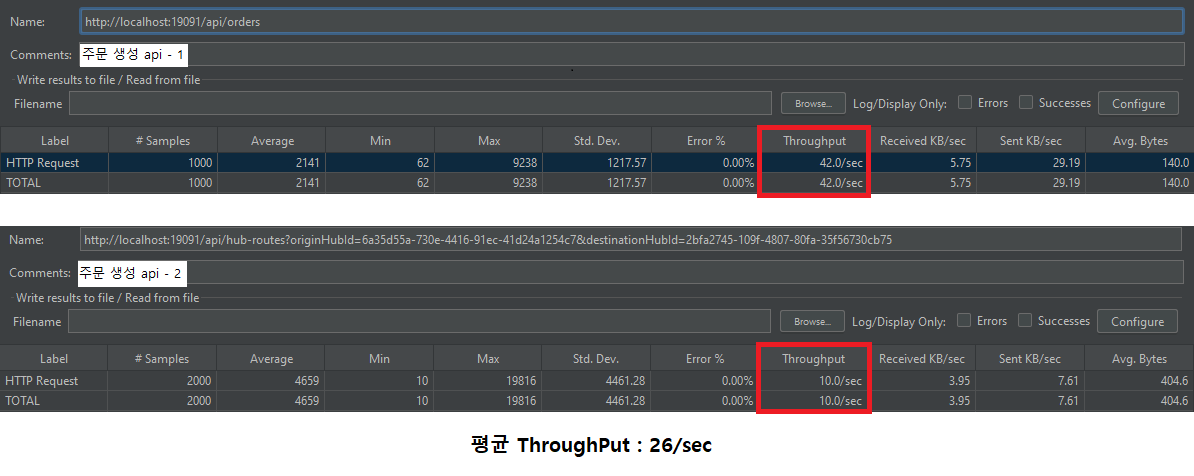 기존 시스템은 주문 생성 API를 시작으로, 배달 생성 → 배달 경로 계산 → 슬랙 메시지 전송까지 총 4단계의 API 호출이 순차적으로 진행되는 구조였다. JMeter를 활용한 성능 테스트 결과, 동기식 처리 흐름에서 평균 처리량은 약 26건/초(26 TPS) 수준으로 확인되었다.