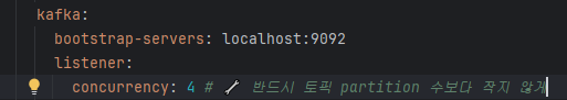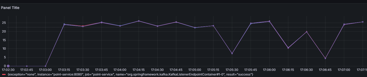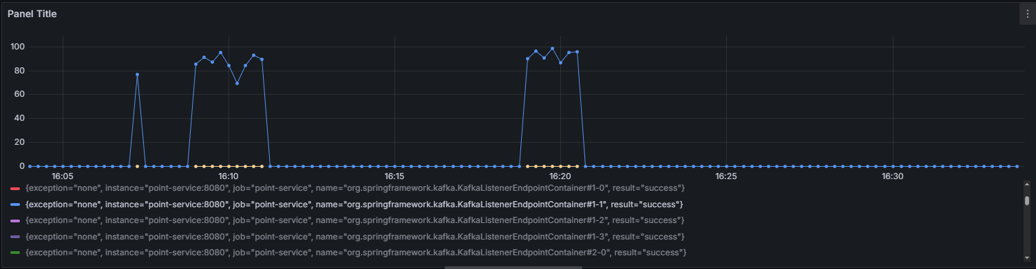 카프카 리스너에서 concurrency=4로 설정했지만 tps를 시각화한 그래프를 보면 하나의 파티션에대한 정보만 수집되고있다. 알고보니 코드는 concurrency=4를 했지만 실제 파티션은 1개라서 그렇다. 이때의 TPS는 약 85정도가 나왔다. 이를 해결하기 위해 카프카내부에 접속해 파티션을 수동으로 1개 -> 4개로 설정해주었다.