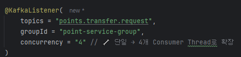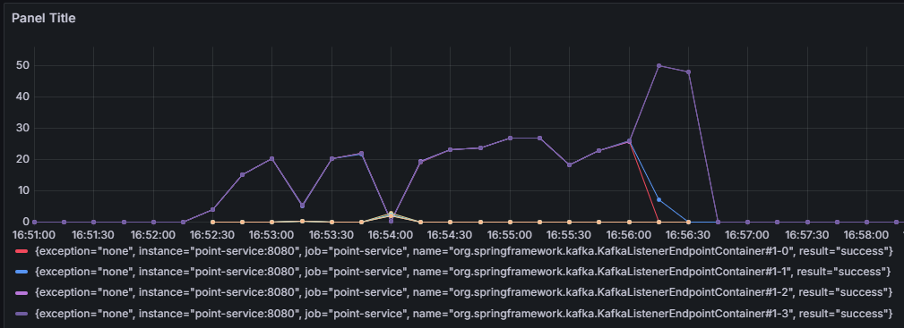 그래프에선 각각의 리스너 인스턴스(TPS)가 낮아 보여도, 이건 분산 소비의 자연스러운 현상이야. 하지만 각 리스너의 TPS를 합산해보면 : 하나의 리스너 당 약 25 TPS * 4 = 약 100TPS로 병렬성을 높여서 전체적인 TPS가 향상했다.
