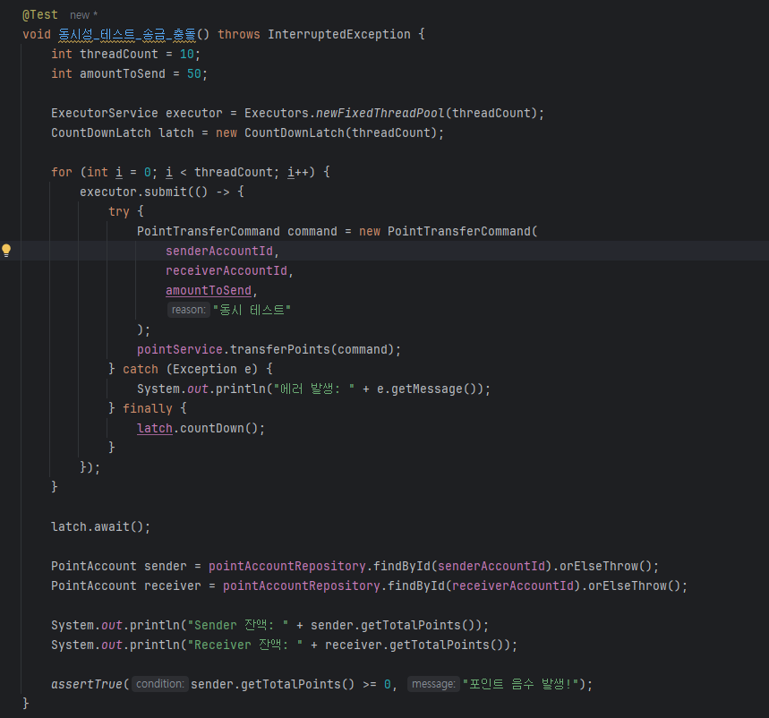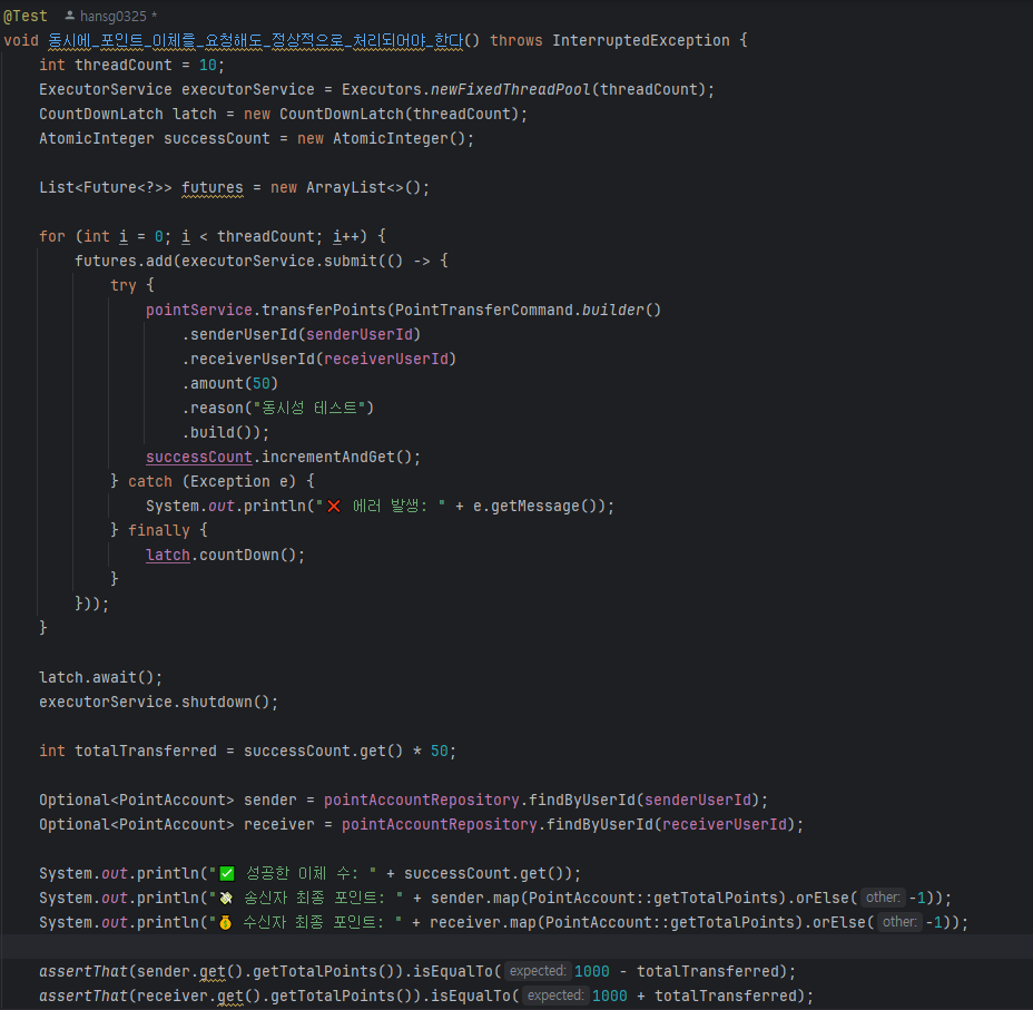 오후 4:38:42: Execution finished ':test --tests "com.timebank.pointservice.service.PointServiceTest.동시성_테스트_송금_충돌"'.