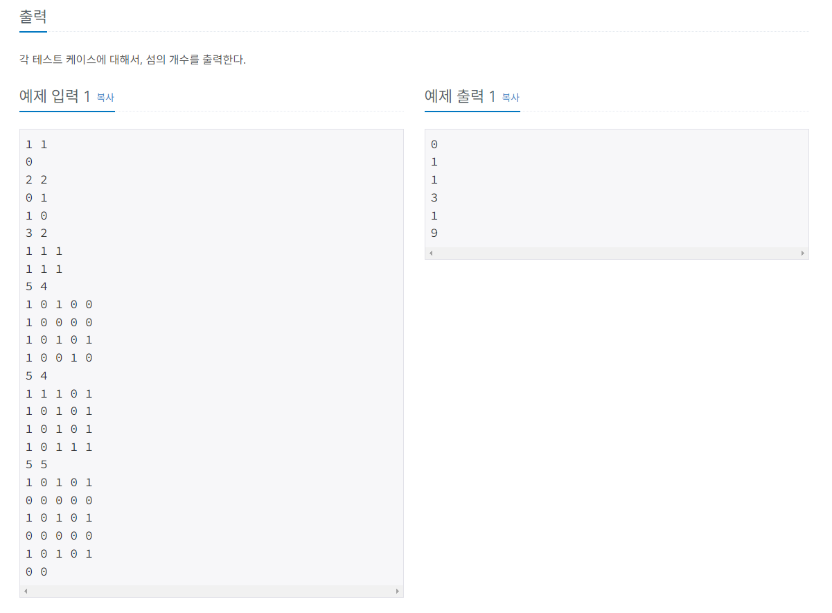 bfs 함수는 섬이있는 자리이면서 visit가 false 인 자리를 기준으로 8방 탐색을 실행한다. 8방 탐색을 실행할때 탐색한자리에 에 또 섬이있고 방문한적이 없는 자리면 그 자리를 기준으로 다시 bfs함수를 실행한다.
