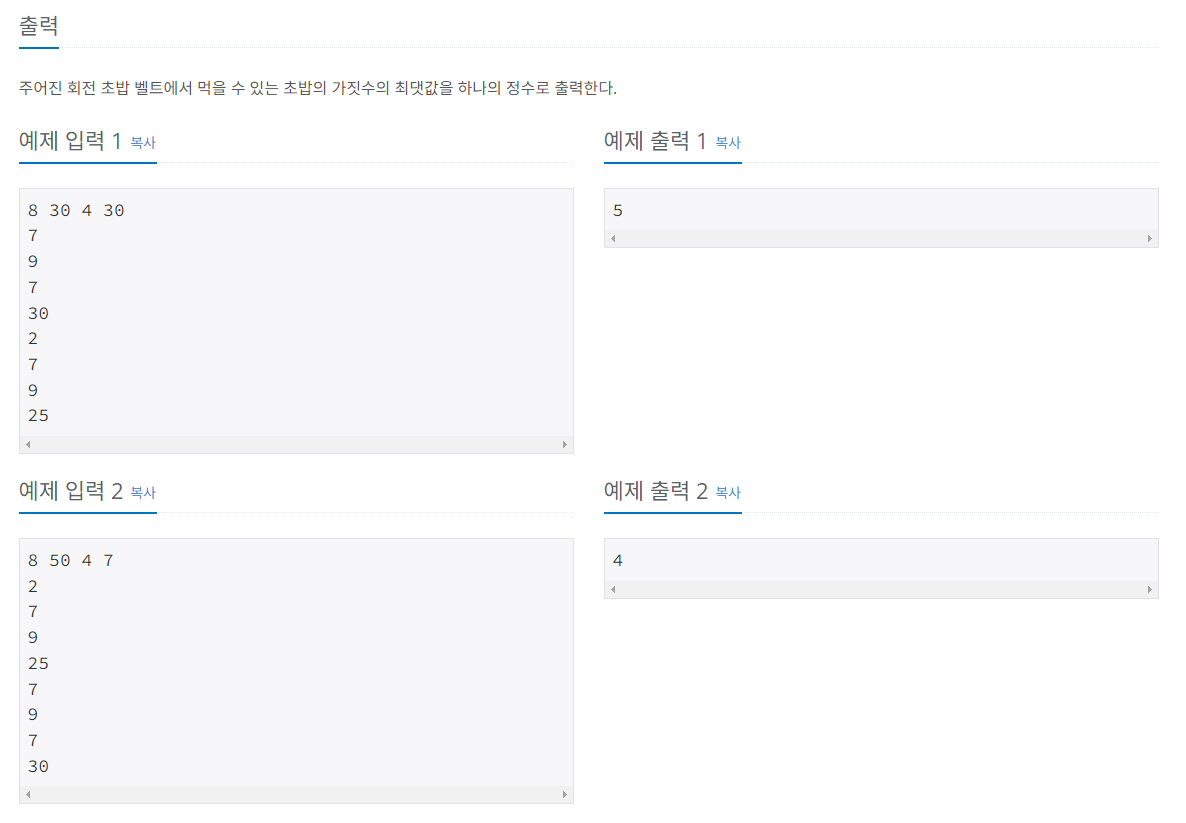 첫 번째 줄에는 회전 초밥 벨트에 놓인 접시의 수 N, 초밥의 가짓수 d, 연속해서 먹는 접시의 수 k, 쿠폰 번호 c가 각각 하나의 빈 칸을 사이에 두고 주어진다. 단, 2 ≤ N ≤ 3,000,000, 2 ≤ d ≤ 3,000, 2