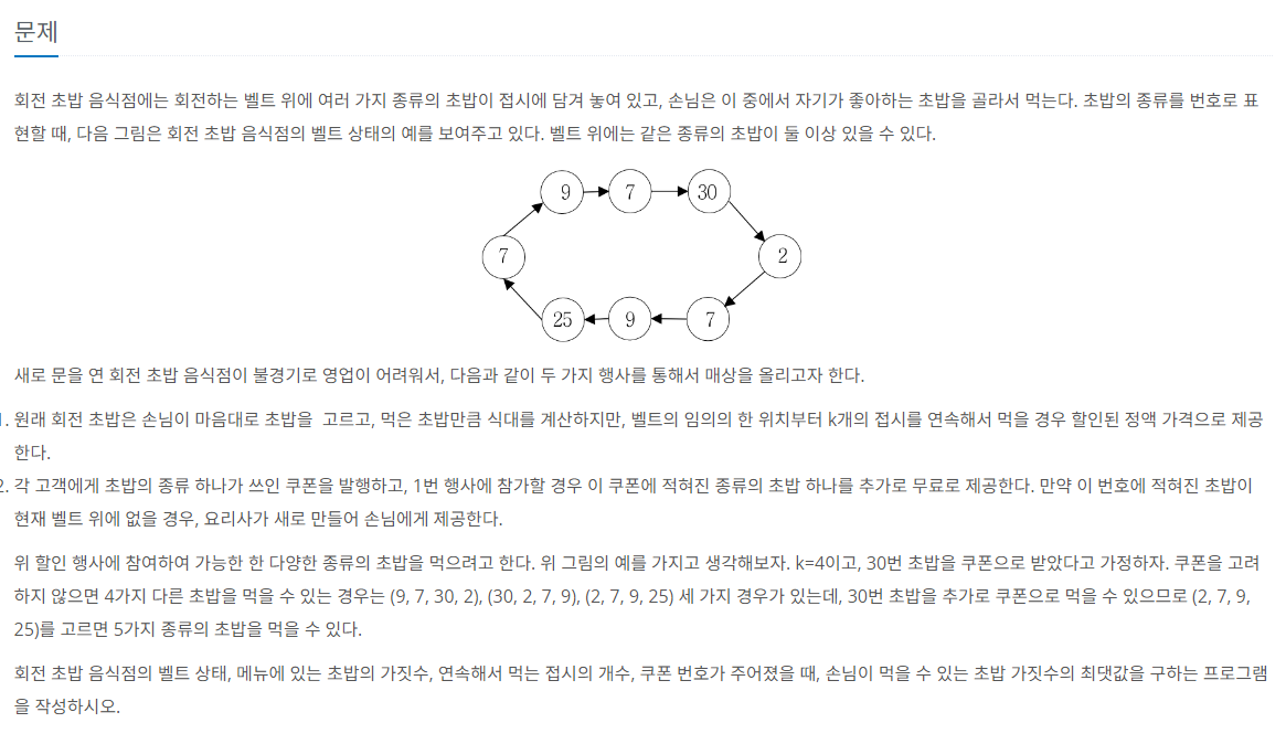 if(eat[dishes[start-1]] == 1) { // start-1 초밥이 이미 먹은 초밥이라면 cnt--