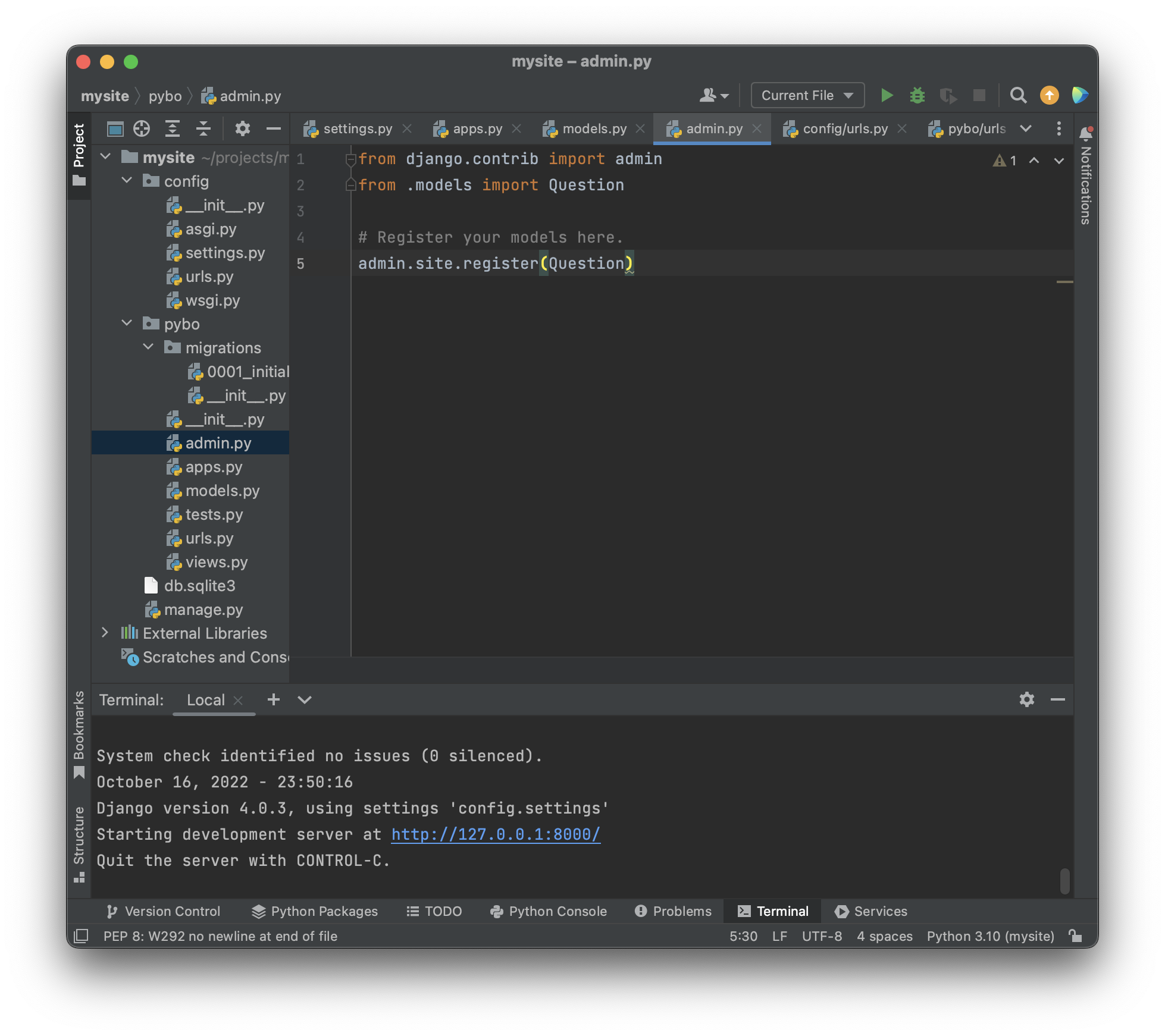바로 전에 작성한것 밑에다가 적어주면 된다. 원래는 <ul> 태그로 간단하게 작성했던 질문 목록을 테이블 구조로 변경했다. 번호와 작성일시 항목도 추가했다. 번호는 for 문의 현재 순서를 의미하는 {{ forloop.counter }} 를 이용했다. 여기서 사용한 class="container my-3", class="table", class="table-dark" 등은 부트스트랩 스타일에 정의되어 있는 클래스들이다. 부트스트랩에 대한 자세한 내용은 다음 링크를 참조하자.