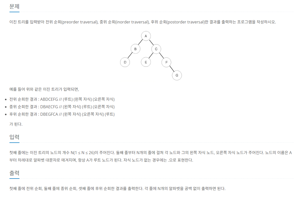 트리를 순회하는 문제이다. 트리 탐색의 아주 기초문제이지만 너무 오랜만에 풀어서 도저히 풀 수가 없어 다른 글을 참고했다.