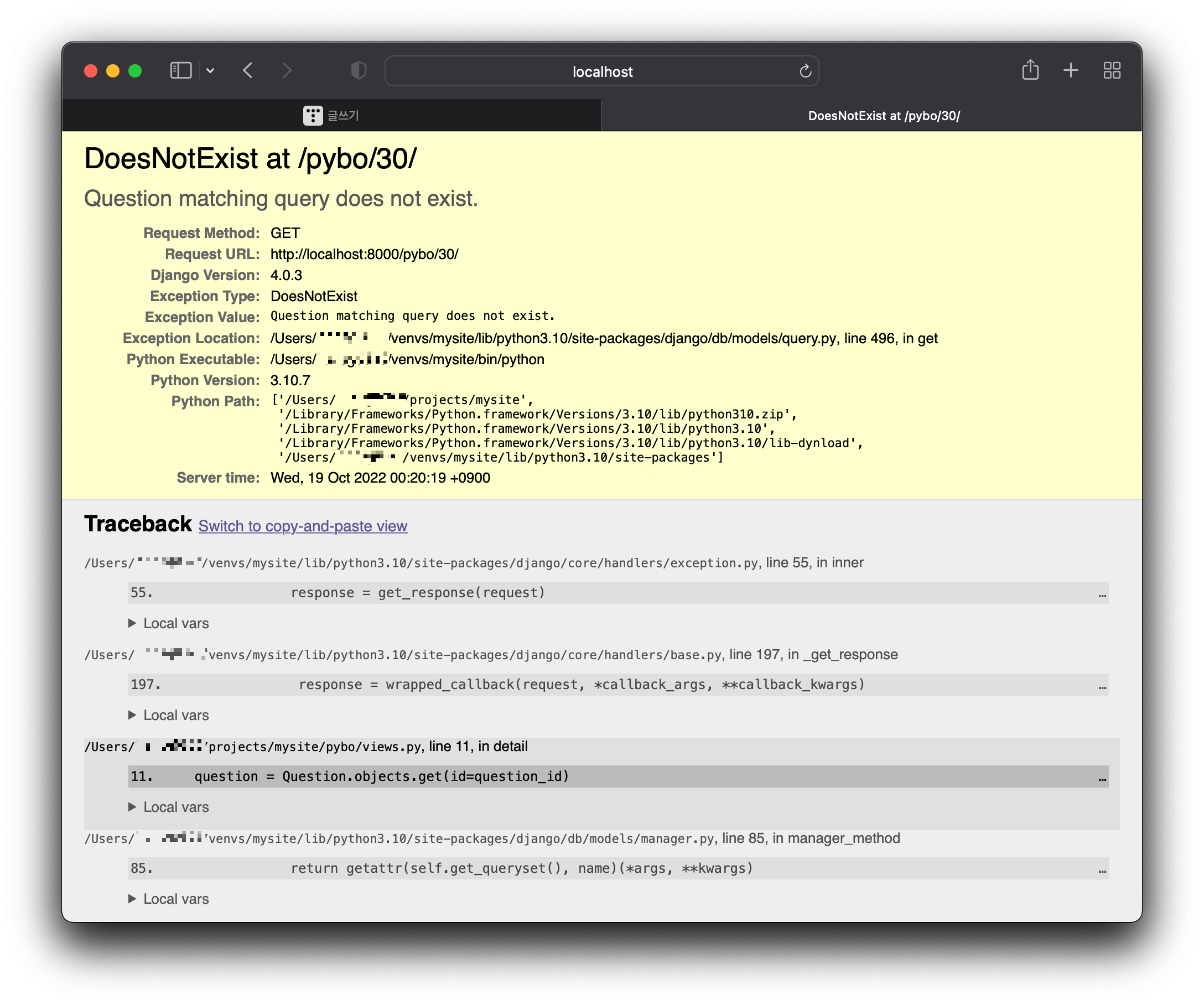 http://localhost:8000/pybo/30/ 페이지를 요청했을때의 모습이다. DoesNotExist 오류가 발생한다. 이 오류는 전달된 question_id 가 30이기 때문에 Question.object.get(id=30)이 호출되어 발생한 오류이다. 이때 브라우저에 전달되는 오류코드는 500이다.