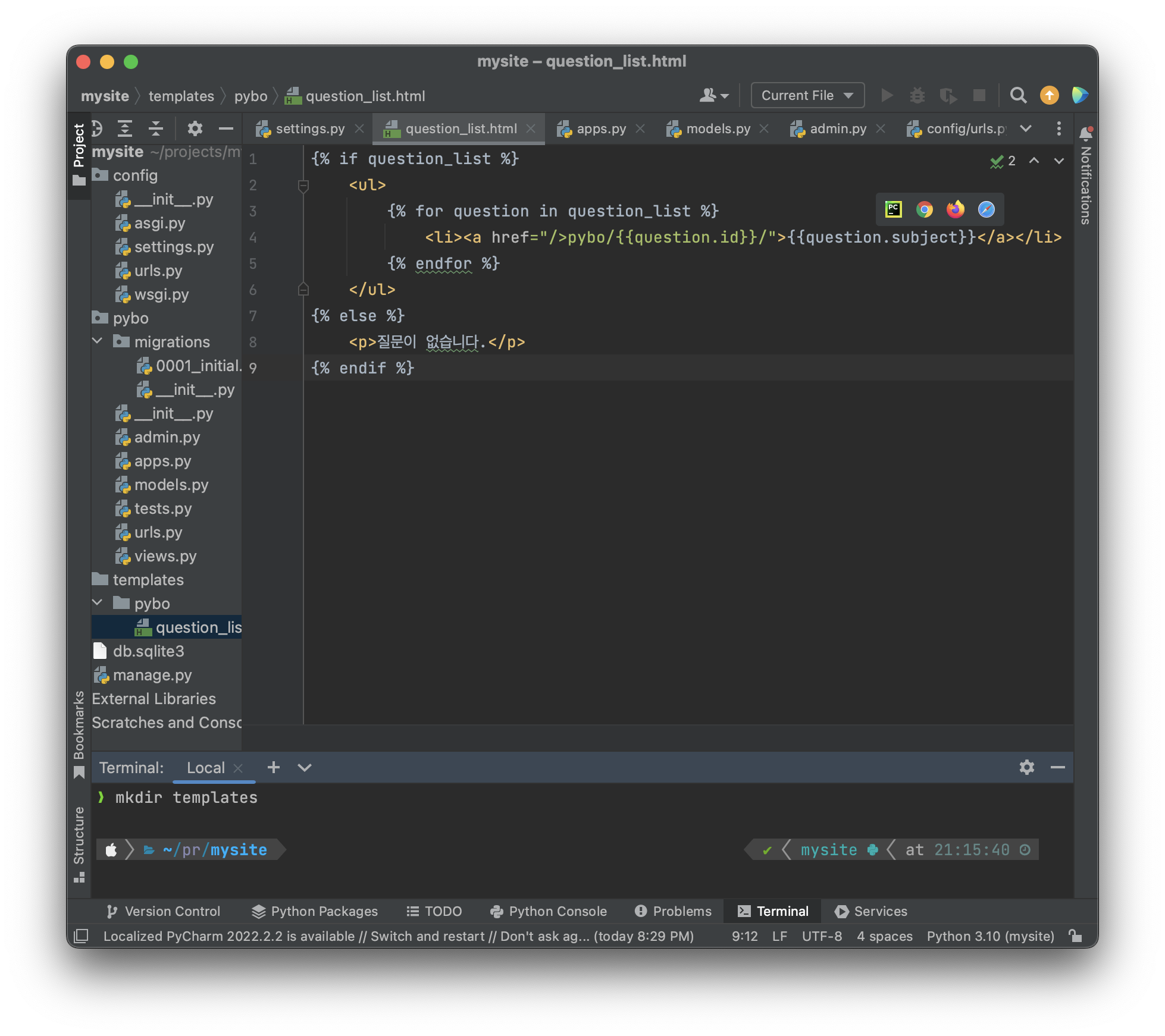 http://localhost:8000/pybo/ 페이지에 들어가면 등록한 질문을 볼 수 있도록 구현해 보자.