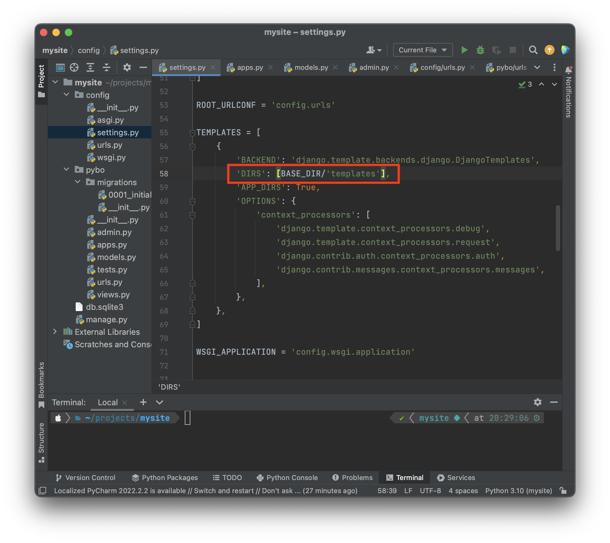 DIR는 템플릿 디렉토리를 여러개 등록할 수 있도록 리스트로 되어 있다. 파이보는 BASE_DIR/'templates' 디렉토리 한 개만 등록한다. 여기서 BASE_DIR 은 /Users/h<사용자명>/projects/mysite 이다.