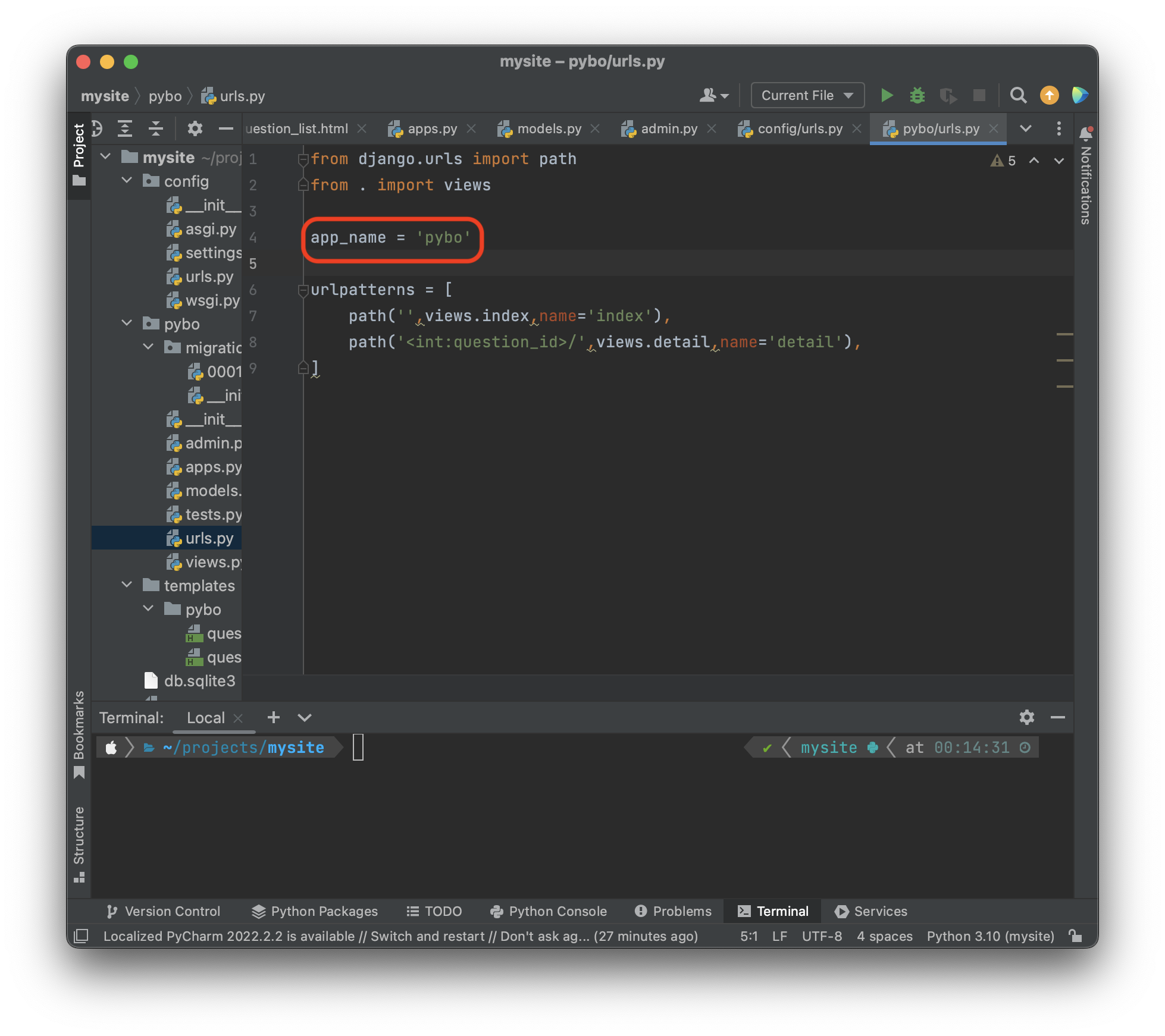 링크의 주소 대신 별칭을 사용하려면 URL 매핑에 name 속성을 부여해야한다. pybbo/urls.py 파일을 수정하자.