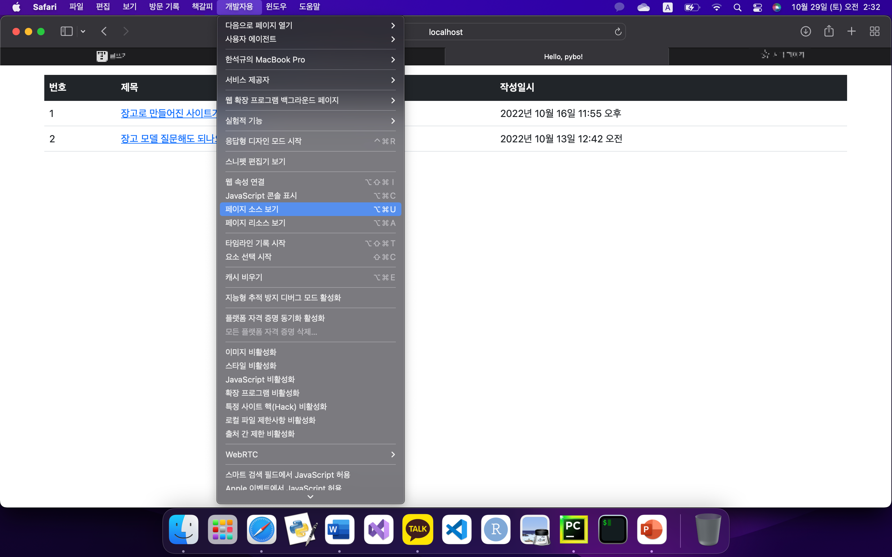 이제 http://localhost:8000/pybo 페이지를 열어보면 화면에 보여지는 것은 동일하지만 표준 HTML 로 작성되어있다. 이 사실을 확인하려면 맥os 사파리 기준으로