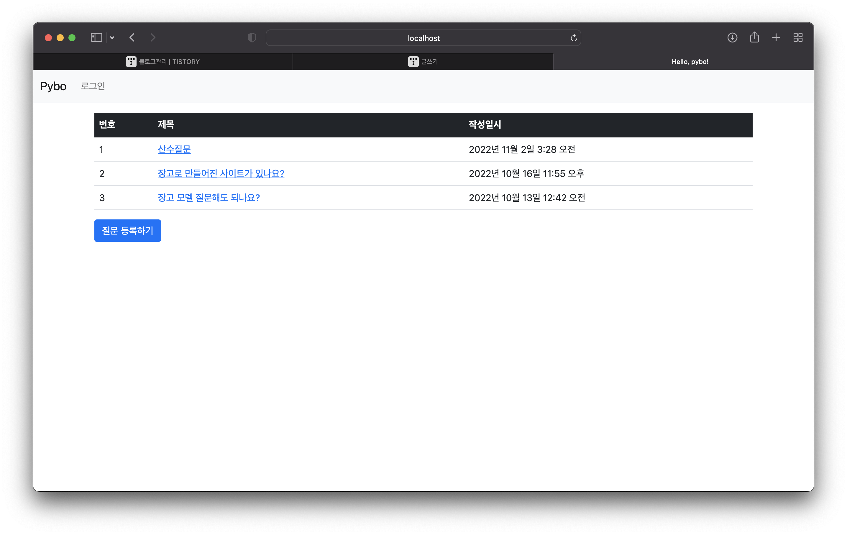 좌상단에 Pybo 아이콘과 로그인 아이콘이 생겼다. 아무 페이지에서 Pybo 를 누르면 메인 페이지로 돌아간다. 로그인 버튼은 아직 설정을 안해서 아무런 일도 발생하지 않는다.