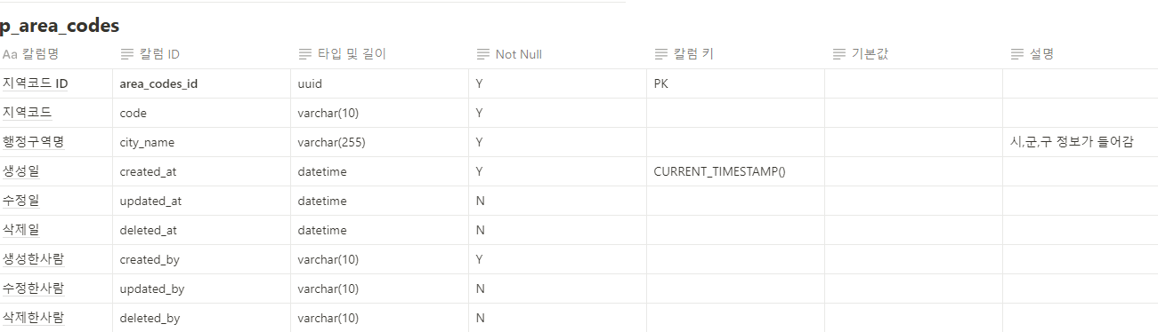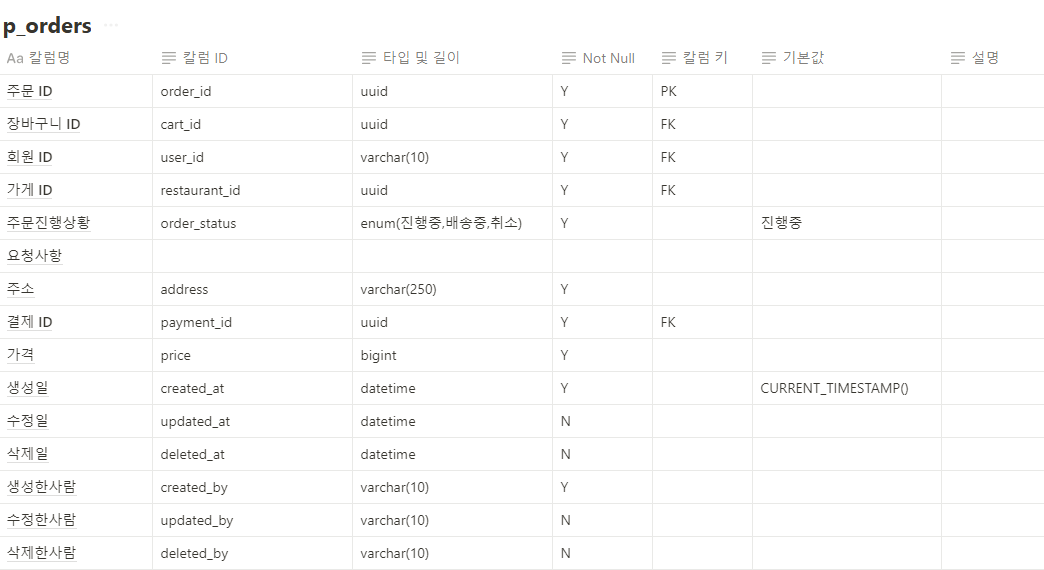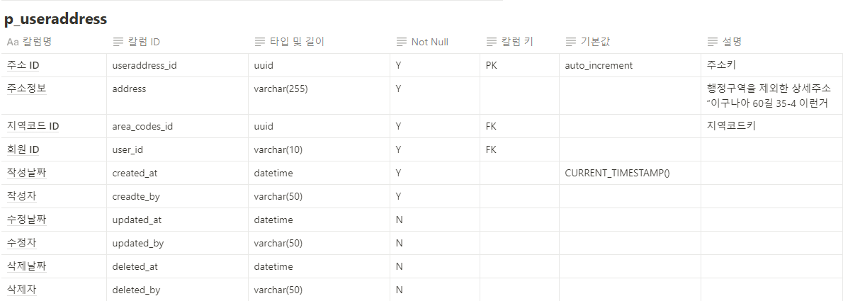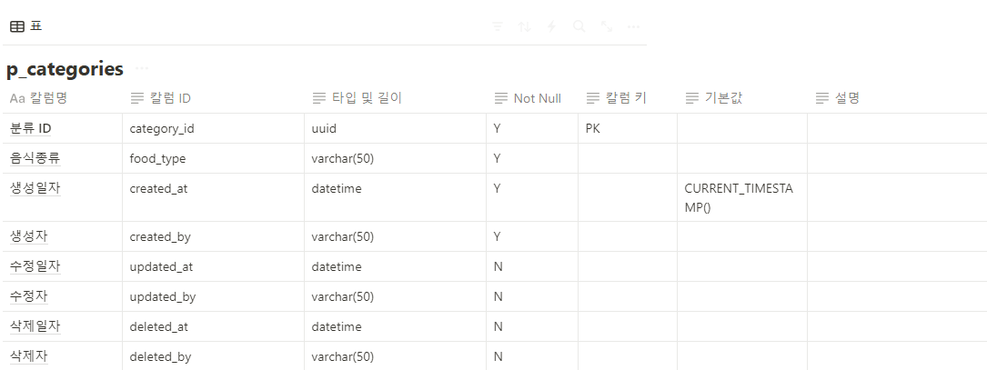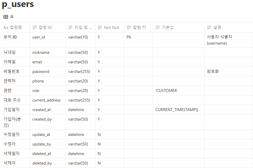 테이블 명세서는 요구사항에 맞게 각 테이블명의 시작은 p_table로 시작한다. 그리고 유저 ID는 최소 4자 ~ 10자. 다른 테이블의 id는 UUID로 정의했다. 모든 테이블은 데이터 감사 로그를 기록해야하므로 created_at, created_by, updated_at, updated_by, deleted_at, deleted_by 필드를 추가했다.