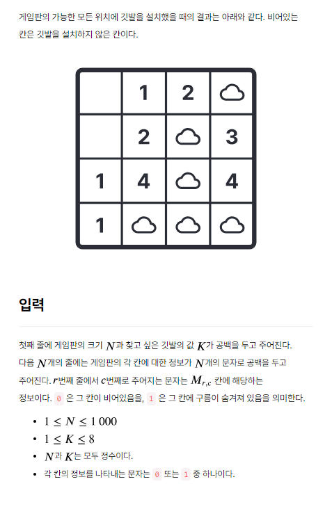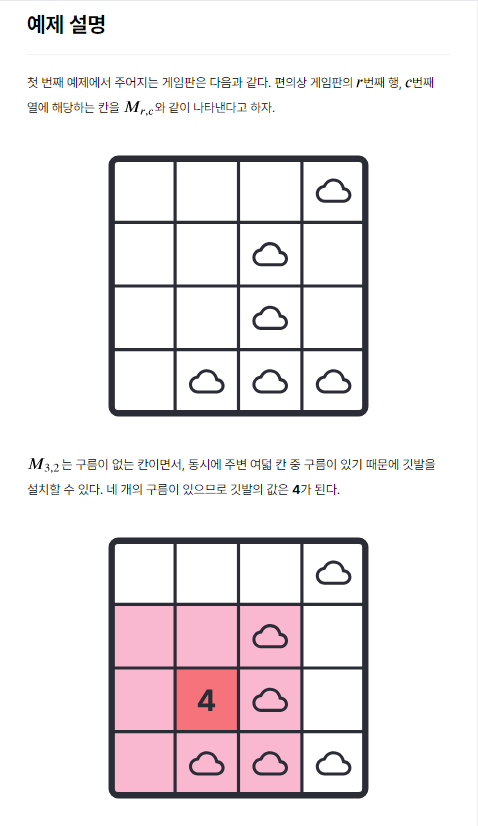 문제를 보자마자 아 이거 나 혼자 못풀겠다! 싶었다. 저번에도 프로그래머스에서 지뢰찾기 문제를 푼 적이 있었는데 그때도 매우 어렵게 여러블로그 찾아가며 풀었었다. 8방탐색이란걸 해서 풀면 나름 쉽게 풀린다고 한다. 구름에서 제공한 풀이를보면 dx/dy 탐색법을 사용하면 된다고 한다. 하지만 dx/dy 탐색법이란걸 봐도 이해가 잘 안가서 나만의 방법으로 했다. 풀이가 되게 간단하고 허접하다. 각 방향별 상,하,좌,우, 대각선 총 8개의 if문이 들어가서 코드가 약간 더럽다. 다음엔 dx/dy 탐색법을 사용해 볼거라고 다짐해보며 일단 현재 풀이의 만족하기로 했다.
