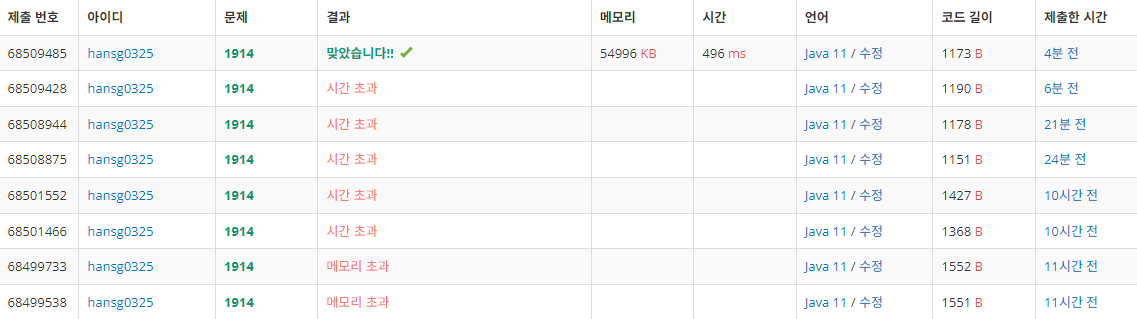처음엔 메모리초과가 발생했다. 알아본 결과 수가 너무 커질 경우 메모리 초과가 발생해 count 를 int 에서 long 으로 변경했다. 그런데 이번엔 시간초과가 발생했다. long 도 문제였다. 한 번 움직일 때마다 count 를 1씩 늘려주는 방식은 N이 매우 큰수가 될때 시간을 많이 잡아먹어 효율이 안좋았다. 애초에 시작할때 움직일만큼의 방정식을 계산해 출력을 해주는것이좋다. 그리고 그때의 타입은 BigInteger가 되어야만 했다. int, long 둘다 N이 100일 경우 메모리를 초과하기 때문이다.